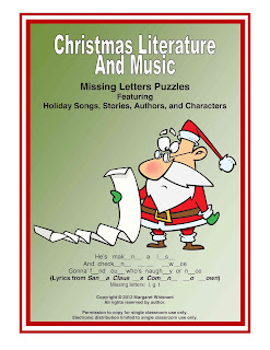 This activity is presented in two parts with 15 items each, all of which are based on a well known holiday song, story, character, or author. Students are challenged to use the given clues, insert the three missing letters in the correct blanks, and solve the puzzle. Prize delivery is delegated to Santa (aka The Teacher).